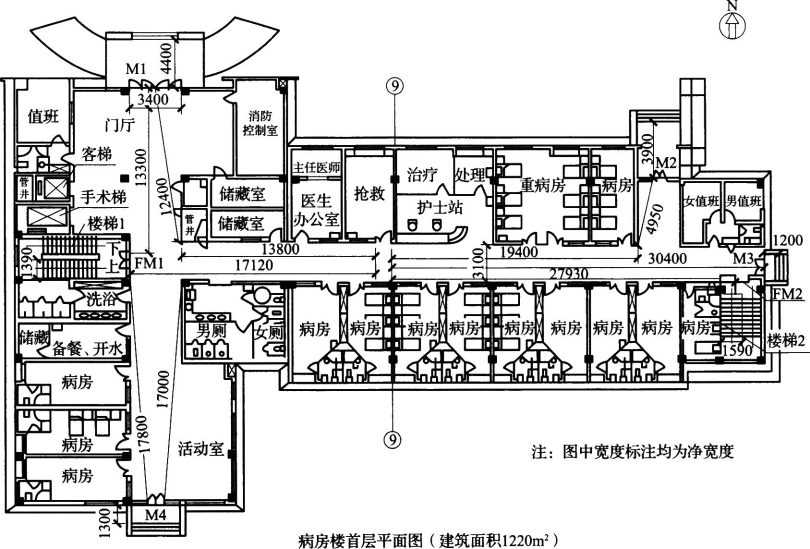 该病房楼六层以下各层建筑面枳均为1220m2。图中一号轴线东侧地下室建筑面积为560m2,布置设备用房。中间走道南侧自西向东依次布置发电机房变配电室(使用干式变压器)9号轴线西侧的地下室布置自行车库。地上一层至地上六层均为病房层。七层(建筑面积为275m2)布置消防水箱间、电梯机房和楼梯出口小间。