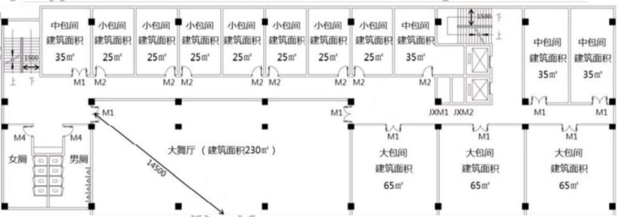 该综合楼三层平面图如图2所示。图中M1、M2为木质隔音门,净宽分别为1.30m和0.90m;M4为普通木门,净宽0.90m;JXM1、JXM2为丙级防火门,门宽0.60m。