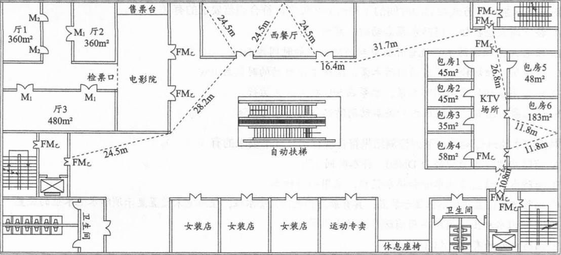 该综合楼地上一至三层为商店营业厅,四层为餐饮店、电影院和KTV等,四层平面布置如图所示。KTV各包房的疏散门均采用乙级防火门,电影院各观众厅疏散门均采用木门,M1宽1.5m,M2宽1.2m。西餐厅内设置了餐饮区和后厨区,餐饮区共设置70个座位,后厨区采用明火器具加工食品。建筑五层及以上均为办公室。考虑到该建筑内部设置室内消火栓系统、自动喷水灭火系统、火灾自动报警系统、防排烟系统等消防设施,装修时遂将办公室疏散走道、西餐厅、KTV等部位墙面和地面装修材料的燃烧性能,在通用标准的基础上降低一级。